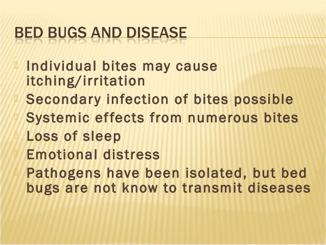 Bed bugs have not been shown to vector diseases, Topical or oral antihistamines can bring relief. Ultimately, Bed Bugs for the Medical Service Provider See www.nysipm.cornell.edu (2008) Delusory parasitosis or mystery bites . ... Read Document